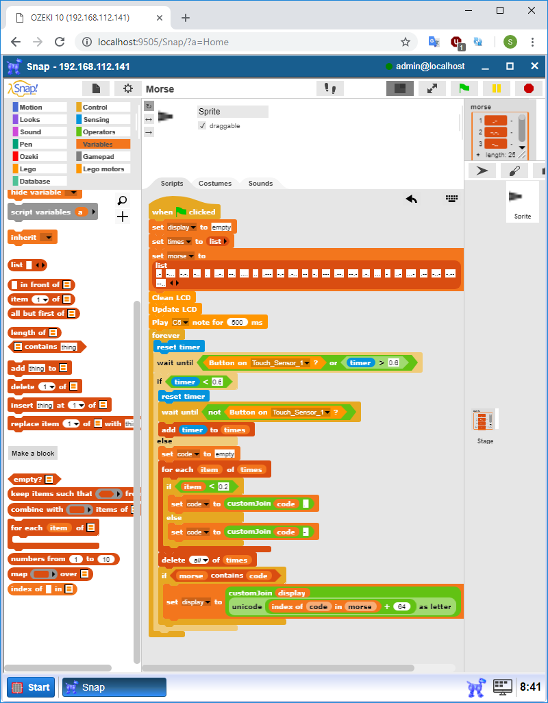 In this lecture you won't need to create any kind of connection in Ozeki 10, so you can start with the creation of the SNAP program. After adding the usual 'when green flag clicked' entry point, you have to create some variables. First create a 'display' variable that will contain the text the program is going to display on the LCD. At first, set its value to 'empty' by using a 'set' block. Create another variable called 'times', and set an empty list to it. In it, you will store the time durations of the button presses. This is for detecting short and long signals. Then create a 'morse' variable and set a list to it that contains the Morse alphabet. These steps are demonstrated in Figure 5.