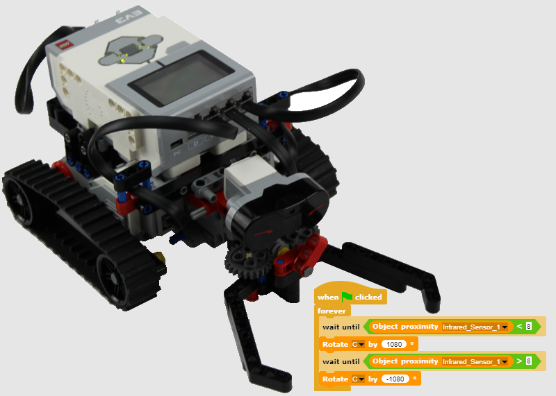 The next block is a 'Rotate X by Y degrees' block (as you can see on Figure 5), where X is a motor (in this case select motor C) and Y is a degree value. You have to use 1080 degrees to open the gripper enough. So it will rotate motor B clockwise 1080 degrees. After that put a 'wait until X' block again with an 'X > Y' block. Put the same values into X and Y as in the previous one. So the program after opening the gripper will wait for removing the object from the IR sensor.